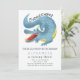 Cartão de modelo com tema de jacaré cômodo, com ilustração de um crocodilo azul e amarelo, com uma festa com o texto "Chomp, chomp há uma festa no pântano!" Um tema perfeito para o aniversário de um menino no verão.