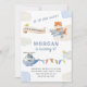 Para cima e para fora! Convide seus pequenos convidados para uma comemoração de alto voo com este belo convite de aniversário para aviões. Com uma raposa voando num avião, um lobo pilotando um helicóptero, pássaros alegres e nuvens de aquarelas moles, esta design combina encantos da floresta com uma aventura na aviação. Personalize o texto para se adequar aos detalhes do seu partido.