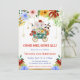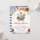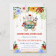 Flores e design de Circo Vermelhas, Azuis e Amarelas Gordas de Aquarela com coelhos, elefantes e panda em um trem e bordas de confete de ouro