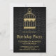 Encontrem seus convidados com este convite de bolsa mensageifesta de aniversario elegante com uma bela gaiola de ouro contra um fundo negro. Basta adicionar os detalhes do seu evento neste modelo fácil de usar para torná-lo um convite de tipo único. Sacudir a placa para revelar uma textura falsa de brilho dourado na parte traseira da placa.