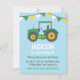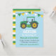 Um trator de fazenda verde com bandeiras de revestimento no topo do convite. O tema perfeito para o aniversariante que ama caminhões e veículos tratores! Paleta colorida de verde, amarelo, branco e cinza! Padrão de distribuição no verso do convite.Personalize facilmente com os detalhes do seu partido.
