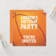 convites de festas perfeitos para um fã de basquete ou jogador de basquete. A frente do convite tem um fecho de uma bola de basquete. O verso do convite apresenta todas as informações para a próxima celebração com texto branco sobre fundo laranja. A cor do texto e do plano de fundo pode ser alterada de acordo com suas próprias necessidades e estilo. Todo o texto é totalmente personalizável para o seu próprio partido.