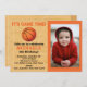 O Convite de festas de basquete apresenta um gráfico de basquete, uma bola de basquete e um lugar para uma fotografia. Personalize todo o texto de acordo com as necessidades do seu partido.