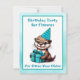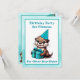 Convites de aniversário para a festa de aniversário de um menino. Ótila de desenho em azul e turquesa com bolos de aniversário, chapéus de aniversário com presentes e sendo super fofa!