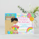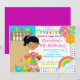 Comece sua festa de aniversário com nossa linda e brilhante e colorido... uma convite de aniversário de boliche com uma garota africana bonita, numa boliche, com um balão e bolas de boliche cor de rosa e laranja... em um fundo de bolinhas fofinho com um belo, amarelo, verde, azul turquesa, rosa e laranja. A parte de trás do convite apresenta uma cor roxa coordenada. Totalmente personalizável por você com suas informações. ©JW Ilustrations