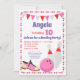 Um convite para o aniversário de boliches para a sua aniversariante. Com bola de boliche, pinos e calçados de boliche. Rosa, roxo, vermelho e lavanda.