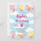 Um convite bonito para borboletas com caligrafia rosa, borboletas cor-de-água rosa e roxa, e um fundo azul-céu com nuvens brancas. Personalize o convite com detalhes para a sua festa temática da borboleta.
