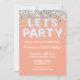 Peach Silver Glitter Convite de aniversário para qualquer idade com escrevendo moderno de escrita e balões de folha divertida.