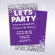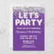Convite de aniversário Roxo Silver Glitter para qualquer idade com escrevendo moderno de escrita e balões de folha divertida.