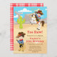 Este convite bonito e divertido tem um vaqueiro com cabelo moreno e pele justa. Numa pose ele está cavalgando um cavalo e jogando um lasso e na outra ele tem uma corda e está acenando. No fundo está uma cena ocidental com areia, montanhas e cacto. O texto combina fontes decorativas e sans serif para um aspecto na moda e moderno. Isto é perfeito para um vaqueiro ou festa de aniversário temática ocidental.