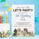 "Venha, Corra, Jogue Pawty Vamos". Convide-os para o aniversário do seu precioso de estimação com estes convites de festas giros e divertidos de cachorros com filhotes, chapéus de festa e confete. As palavras "Vamos Pawty" estão em um texto impresso de pata divertida. Use as modelos fornecidas para personalizá-las com a idade, o nome e os detalhes da festa do seu animal de estimação. Você também pode mudar as cores do texto azul e/ou preto para o seu favorito. Um giro padrão de confete enfeita a frente e o verso do cartão.