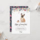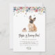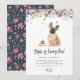 Woof! Convide a família e os amigos com este convite de aniversário de cão personalizável. Apresenta uma garland floral de aquarela, um bonito buldogue francês e um padrão floral correspondente para o verso do convite. Este convite francês para cadelas de buldogue é perfeito para festas de aniversário de crianças e festas de aniversário de cães. Os textos são perfeitamente editáveis para qualquer ocasião. Personalize adicionando seus próprios detalhes de evento.
