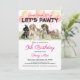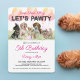 "Venha, Corra, Jogue Pawty Vamos". Convide-os para o aniversário do seu precioso de estimação com estes convites de festas bonitinhos de cachorro com filhotes, chapéus de festas e balões. As palavras "Vamos Pawty" estão em um texto impresso de pata divertida. Use as modelos fornecidas para personalizá-las com a idade, o nome e os detalhes da festa do seu animal de estimação. Você também pode mudar as cores de texto rosa e/ou preto para o seu favorito. Um lindo padrão de impressão de pata preta enfeita a parte traseira do cartão.