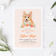 Watercolor Corgi Peach Florals Dog Birthday Invitation. Comemore com este charmoso e caprichoso convite de aniversário que inclui ilustrações aquáticas de um cão-corgi com sotaque floral de pêssego e fundo foliar. Personalize adicionando os detalhes do evento. Você também pode alterar a imagem traseira para qualquer foto ou imagem que queira apresentar. Este convite floral é perfeito para festas de aniversário de crianças e cães.