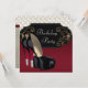 Calçados de designer de sola vermelha e preta elegantes com convites de festas de aniversários damask brancos. Altos saltos pretos clássicos com convites de festas de aniversários de damasco vermelho e dourado e preto. Personalize simplesmente adicionando seus detalhes de evento, estilo de fonte, tamanho de fonte e cor e texto à frente e atrás.