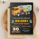Incêndios para seus convidados com esta festa de aniversário de lixo exclusiva, convidando um caminhão de lixo legal com tipografia moderna contra fundo de quadro. Basta adicionar os detalhes do seu evento neste modelo fácil de usar para torná-lo um convite de tipo único. Sacudir a placa para revelar um padrão de listras amarelas e pretas vibrantes na parte traseira da placa.