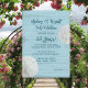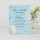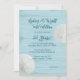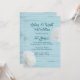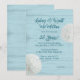 Convite de festa de aniversário de casamento com tema de praia com dólares de areia e design de madeira azul. O texto azul-esverdeado escuro é fácil de personalizar sobre um fundo de madeira azul claro. Dois dólares de areia naturais também decoram as bordas do papel. Escolha atualizar com um dos papéis especiais oferecidos.