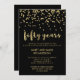 Esses convites festivos e elegantes são perfeitos para uma festa de aniversário de casamento de 50 anos! Confetes dourados falsos e tipografia moderna são colocados contra um fundo preto escuro. Perfeito para uma celebração de aniversário dourada.