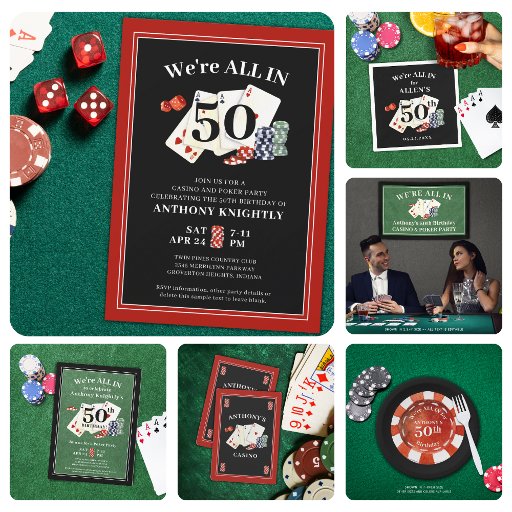 Convite de aniversário temático personalizado do casino ou do partido de pôquer, com cartas de jogar, dados e chips de pôquer e idade editável em preto, vermelho e branco. ASSISTÊNCIA: para obter ajuda com a modificação/personalização do design, alteração de cor, transferência do design para outro produto ou, se você quiser coordenar itens, entre em contato com o designer ANTES DE ENCOMENDAR através da guia MENSAGEM de bate-papo Zazzle ou por e-mail em makeitaboutyoustore@gmail.com.