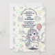 Um convite de aniversário de um unicórnio com tema de unicórnio apresentando um unicórnio fofo com um balão, uma borda ao estilo vintage e rabiscos feitos à mão de castelos, estrelas e presentes. As cores pastéis moles dão o tom para uma celebração mágica e cintilante.