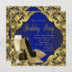 Calçado de salto alto e convites de festas de aniversários de champanhe. Este elegante convite de aniversário azul real e dourado é facilmente personalizado para o seu partido ou evento, adicionando detalhes do evento, estilo de fonte, tamanho de fonte e cor e texto. Este é um design impresso sem brilho real.