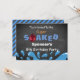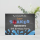 Diga-lhes que é hora de se divertir e se molhar. Um convite de aniversário divertido com água esparramando e a mensagem, "Você é convidado para ficar super encharcado" Adicione nome e idade. A parte traseira tem legal faixas azuis e pretas com personalização linha a linha.
