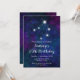 Este convite de aniversário cósmico e celeste apresenta a constelação de Zodiac de Libra sobre um fundo de galáxia azul-escura e cor-d-água roxa com estrelas dispersas. O texto combina o script manuscrito e as fontes serif modernas para um aspecto na moda e clássico. Isto é perfeito para os partidos temáticos da astrologia.