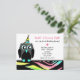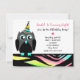 Um convite de festa de aniversário com ilustração de uma coruja negra e cinza com garras azuis e bico à esquerda. Coruja está vestindo uma impressão de zebra com uma festa de neon que corresponde à borda no fundo. Personalize o texto rosa e preto com detalhes da sua ocasião.