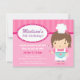 Organize uma festa de aniversário de panificação em casa ou um estúdio de cozinhar especial e envolva seus filhos convidados no processo de panificação divertida e faça cupcakes e cookies que eles possam curtir na festa ou levar para casa! Este convite apresenta uma garota bonita com banda de cabelo rosa, chapéu de chef e avental branco. Ela está segurando um uísque e preparando a mistura de panificação em uma tigela com forma cardíaca. Matizes de rosa, pontos e listras são doces e giros para uma aniversariante! Personalize facilmente com os detalhes do seu partido!