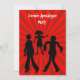 Crianças zombie convites de festas em vermelho e preto. Um design vermelho de fundo com zumbis pretos andando. Adicione todo o texto da parte atrás em uma fonte divertida e assustadora.