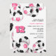 Este convite de festas de tema de futebol bonito apresenta clusters de bolas de futebol cor-de-rosa, preto e branco nas bordas superior e inferior na frente e um cluster de solteiros que cobre a parte de trás do convite - personalize os detalhes da parte em um fundo branco - por katz_d_zynes