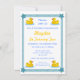 Personalizado para qualquer criança, para a festa de aniversário de um menino ou menina. A borda de design mostra um desenho de uma fita azul com estrelas azuis em cada canto, sobre um fundo branco. Cada canto tem também um adorável pato de borracha amarelo ou pato, nadando em uma poça de água pequena. Festivo, divertido e muito bonito. O texto da redação é amarelo e azul, de modo a corresponder aos patos e à fronteira. Há uma linha extra para informações de festa para seus convidados. Basta adicionar suas informações - manter, alterar ou excluir texto conforme necessário. Consulte descontos de quantidade para ordens maiores.