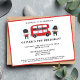 Cute London Themed Convite de aniversário com um ônibus vermelho de dois andares, guarda de palácio e policial. Back tem um fundo vermelho e tem texto e idade personalizáveis.