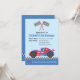 Um convite de festas de aniversário de corrida para aniversários que adoram carros de corrida. Este convite vem com um motorista de corrida em um carro de corrida azul e vermelha com decorações de estrelas e elementos de bandeiras preto e branco. Personalize com os detalhes da sua parte no modelo de texto fornecido.