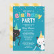 Convite de festas de aniversário bonito para crianças pequenas. O convite de aniversário apresenta dois gatos dançando sob um confete colorido. Um gato é preto, o outro branco. Os gatos estão vestindo chapéus de bolinhas. O aniversário está escrito em uma fonte colorida de balão. A parte traseira apresenta um padrão de verificação amarelo. Um convite de aniversário colorido e divertido para as crianças!
