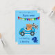 Um ursinho de pelúcia senta-se num carro de corrida, acenando com uma bandeira marcada. Ele veste óculos, e tem uma faixa colorida sobre ele. Abaixo dele está seu texto personalizado em azul escuro, e colocado sobre um fundo azul. O verso tem uma imagem das luzes de início de corrida, além das informações personalizadas do seu partido. Fofo para o aniversário de um menino, e você pode personalizar todo o texto para qualquer coisa que quiser. *Obrigados para a Clipart Real Deal para o cliente usado para criar este design.