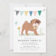 Convites de festas de aniversários bonitos e coloridos com bandeiras coloridas de bunting no topo e um adorável cachorro vestindo uma gravata de arco com flores e uma borboleta ao seu redor. Personalize os convites de aniversário de cachorros adicionando o nome, a idade e os detalhes da festa da criança. O convite para o aniversário do cão reverte-se para apresentar um padrão de flores cremosas contra um fundo aqua.