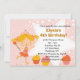 Diversão convite de aniversário de princesa fada com uma menina vestida de rosa e laranja e três cupcakes coloridos com aspersores. Completamente personalizável.