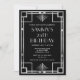 Este elegante e glamouroso convite de aniversário apresenta um quadro de prata de deco de arte num fundo negro. O texto combina fontes decorativas e sans serif modernas para uma aparência retrô e vintage. Isto é perfeito para um tema Gatsby 1920.