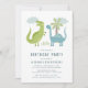 Convites de festas de aniversários bonitos de dinossauros para crianças com dinossauros verdes e azuis com fundo de nuvens, palmeira e grama verde. Personalize os convites para dinossauros adicionando o nome, a idade e os detalhes da festa do seu filho. O convite reverte para um padrão de dinossauros verdes, azuis, laranja, menta e vermelho de coral com palmeiras e folhagem. Convidado perfeito para festas de aniversário infantis de dinossauro!