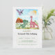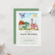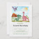 Convite de aniversário dos dinossauros de aquarela verde apresentando dinossauros bonitos em um fundo branco.