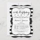 Personalize este convite de aniversário formal, elegante, preto e branco, padrão striped adulto ou adolescente com fontes pretas. Ano perfeito para primavera, verão, outono ou festas de aniversário de inverno. Design de tendência neutra para homem ou mulher, menino ou menina. Na moda, convite clássico para qualquer aniversário de um marco adulto ou adolescente, incluindo 16, 18, 21rua, 30, 40, 50, 60, 70, 75, 80, 85, 90, 95, 100 anos. Na moda vintage sinta um convite em forma de colchete.