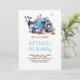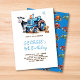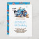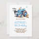 Convites de festas de aniversários do trator azul. Os convites para a festa temática da fazenda têm um design divertido no topo que inclui uma vaca, um filhote e um gato, com um pássaro azul. O texto é impresso em castanho com o nome e a idade em azul. A parte de trás do papel está coberta por um padrão de trator. Escolha qualquer tipo de papel ou comprar o download instantâneo e compartilhe os convites on-line.