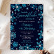 Este convite elegante e glamouroso apresenta flocos de neve brilhante azul-aquarela e prateada e faíscas sobre fundo azul-marinho. É perfeito para uma festa de aniversário temática de inverno ou Natal.
