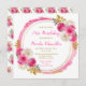 Belo convite de aniversário com um quadro brilhante cor-de-rosa quente e dourado com arranjos florais. Perfeito para uma festa de aniversário. As palavras podem ser alteradas para se adequarem aos seus próprios detalhes ou requisitos