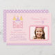 Um convite de festas real na moda para a sua pequena princesa! Inclui um castelo, espaço enquadrado para a foto do seu filho e texto personalizado. As cores incluem rosa, roxo, amarelo e branco. Um padrão de bolinhas roxo e branco de lavanda se veste na parte traseira da placa.