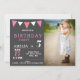 Convite de aniversário de Sinalizadores Rosa Moderno com uma Foto / Este convite de aniversário rosa giro é excelente para uma festa feminina. O convite tem bandeiras cor-de-rosa e brancas de pano de fundo de uma cinza. Personalize o convite com a foto do seu filho. Você também pode alterar todo o texto do convite.