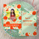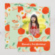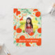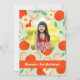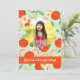 Um convite de aniversário divertido inclui laranjas dançantes e margaridas com uma foto favorita em um quadro floral.