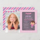 Este convite é para uma menina bonita com rabos de cavalo pulando alegremente num convite feito para parecer um trampolim gigante. Bandeiras de bancada decoram a foto do lado do convite. Perfeito para uma festa de campo interior ou de parque de trampolim! A paleta de cores de pinos e púrpura faz deste excelente de convites para as meninas de aniversário! Personalize facilmente com os detalhes do seu partido. Para ajustar a foto na melhor posição, mude para o modo personalizado e mova a foto em conformidade,
