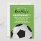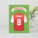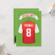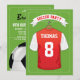 Convites de festa de aniversário com tema de futebol com fundo de campo de futebol verde, uma camisa esportiva vermelha e branca com seu nome e número, uma bola de futebol e um modelo de festa moderno.